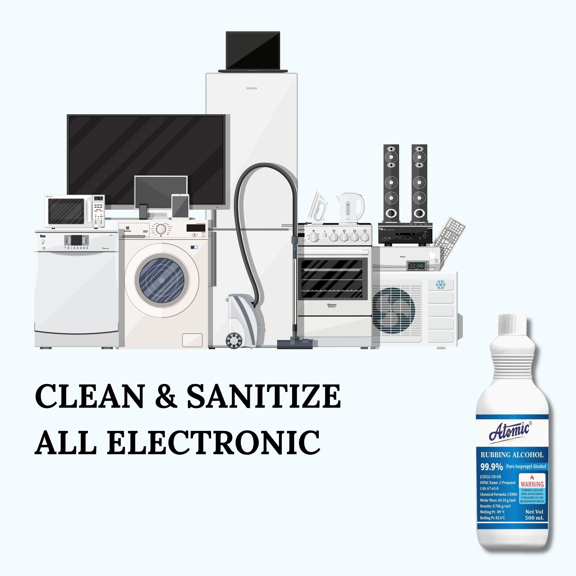 Atomic Rubbing Alcohol 99.9% is a high-purity Isopropyl Alcohol (IPA) designed for fast, residue-free cleaning and sanitizing. Its powerful formula evaporates quickly, making it ideal for electronics, workstations, tools, and household surfaces where moisture or residue must be avoided.